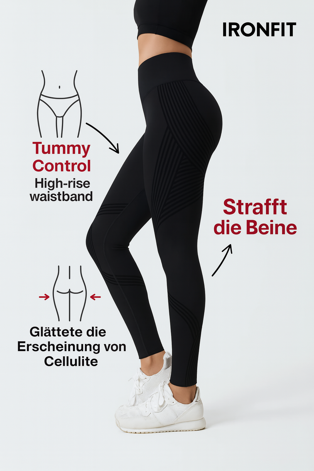 Ironfit-Leggings wurden entwickelt, um dort anzusetzen, wo Cellulite entsteht: bei schlechtem Blutfluss. Die innovativen 3D-Kompressionslinien stimulieren die Mikrozirkulation, fördern die Sauerstoffversorgung des Gewebes und sorgen für sichtbar glattere Haut – ganz ohne zusätzliche Anstrengung.